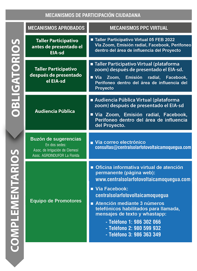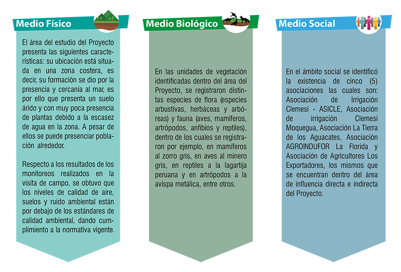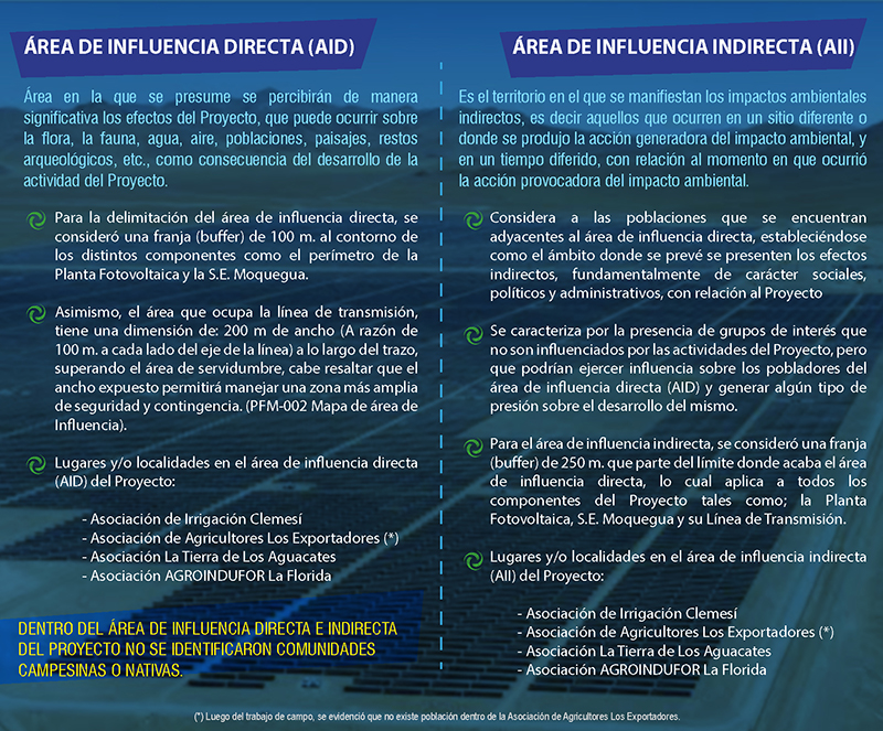 EL EIA-sd del Proyecto “Central Solar Fotovoltáica Moquegua y su Línea de Transmisión", se encuentra en la etapa antes de presentado el Estudio de Impacto Ambiental Semidetallado a la Dirección General de Asuntos Ambientales de Electricidad del Ministerio de Energía y Minas (DGAAE)